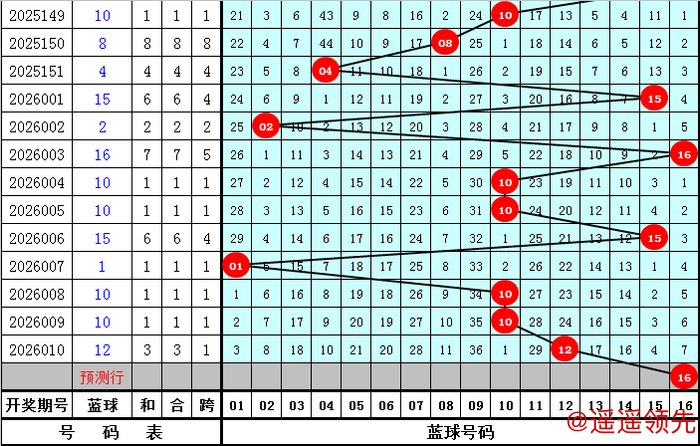 蓝球号码:最近9期分别开出蓝球号码02、16、10、10、15、01、10、10、12,蓝球号码012路个数比为2:6:1,其中2路蓝球走势最冷,本期排除2路蓝球,关注蓝球01、10、13、16。